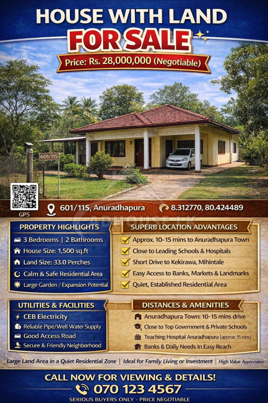 The property is strategically located with easy access to Anuradhapura town and major facilities, making daily life convenient and comfortable.