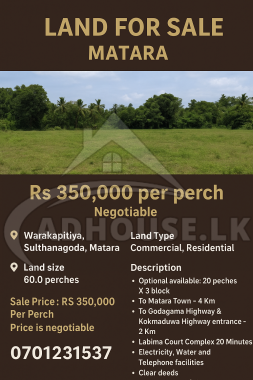 This is an excellent opportunity to acquire a valuable land parcel in a fast-developing area of Matara, suitable for both commercial and residential purposes. Located in a peaceful and green environment, this property offers the perfect balance between urban convenience and calm living, making it ideal for housing projects, commercial developments, investment purposes, or a private residence 🌱🏡