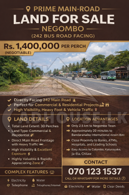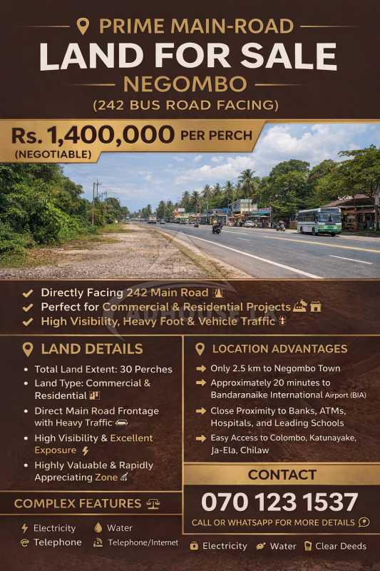 This is a rare and highly valuable land opportunity located directly facing the 242 main road in Negombo, one of the most commercially active and fast-developing areas in the Western Province. With excellent road visibility, constant traffic flow, and strong commercial demand, this property is ideal for both commercial and residential developments 🏗️💎